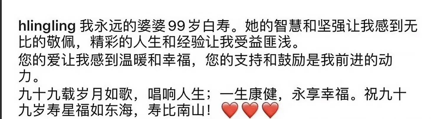 谢玲玲和婆婆余宝珠关系非常好,毕竟是五个孩子的奶奶,余宝珠99岁生日,谢玲玲专门为老太太庆生,还发表文字给前婆婆庆生。